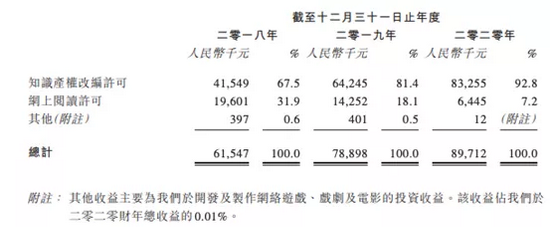 从业务细分来看,恺兴文化营收主要来源为向内容改编伙伴许可知识产权收取费用、向网上阅读平台许可文学作品获得许可费、投资于开发及制作娱乐产品以赚取回报(其他收入)。