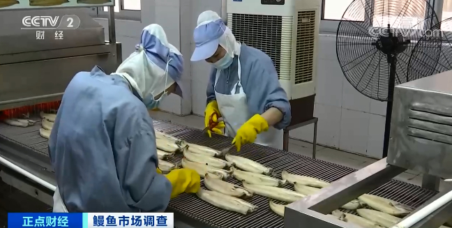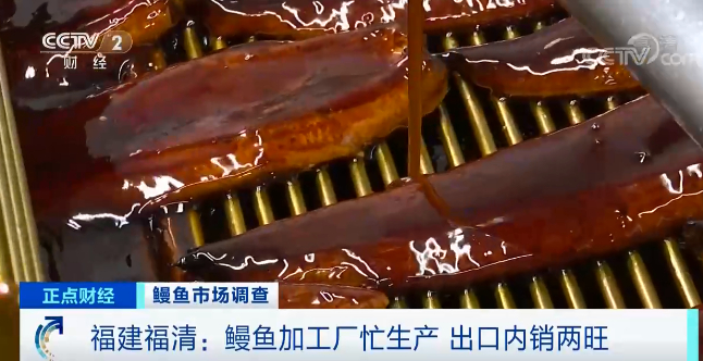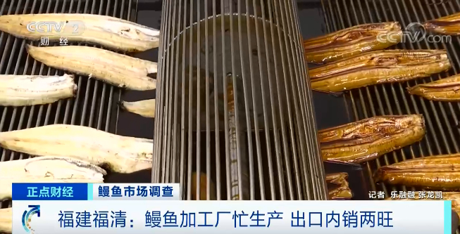 在福建福清的一家鳗鱼加工企业里,记者看到,烤鳗生产线正忙碌生产,烤制、淋酱汁,速冻,经过近10道工序后,一条日式蒲烧鳗就完成了生产,产线负责人告诉记者,他们的产品80%都是出口的,从3月份开始,他们一直在忙着赶订单。