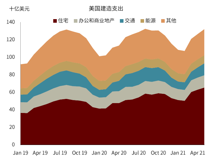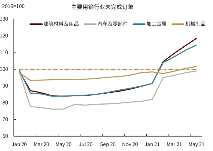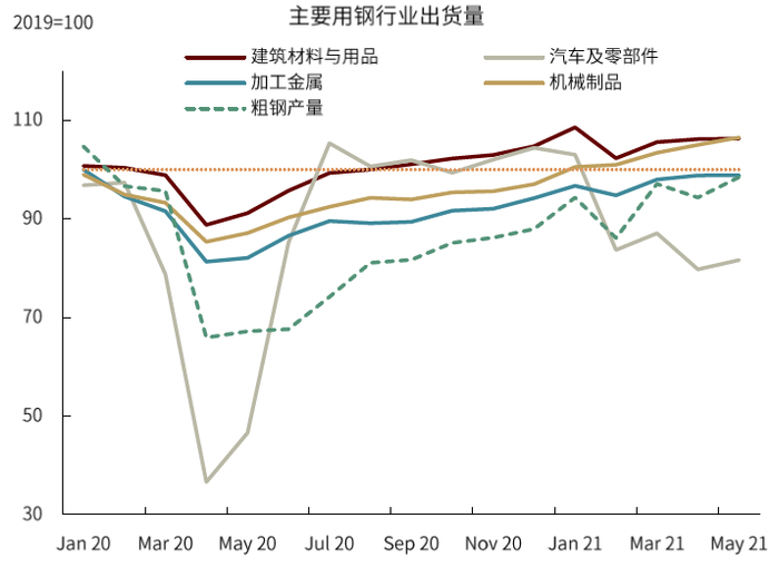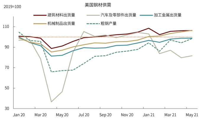 建筑、汽车和机械是美国钢材下游消费最主要的三个行业,占全部国内消费约95%。经济重启后,主要用钢行业均已恢复至或逼近了疫情前的水平。汽车和建筑类材料的出货量在去年7月就已基本回到了2019年的水平,远远快于粗钢产量的恢复。而去年7月正是钢材库存(钢价)进入下降(上升)通道的开始。
