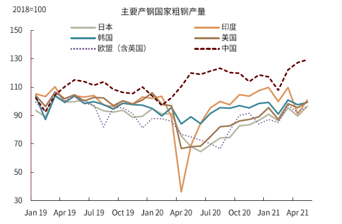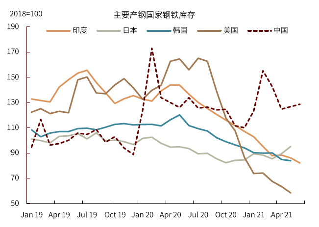 除了原材料如铁矿、废钢、焦炭等的价格大涨而带来的成本推动因素外,全球范围内钢材的供需错配是这轮价格上涨的最主要原因。受疫情影响,除中国外的其他主要国家的粗钢生产都出现了断崖式下滑,但在经济重启后在生产端的复苏却慢于需求。大部分国家的钢铁生产都尚未或刚刚达到疫情前的水平。除中国外,主要产钢国的钢材库存自去年下半年以来皆持续下滑,并显著低于历史平均水平。