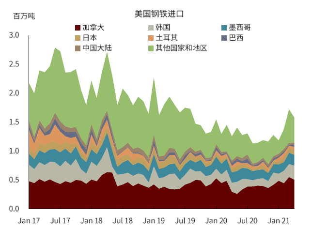 对于美国当前的高钢价,论根本原因固然是国内的供需缺口短时间内难以弥合,但其钢材贸易政策亦限制了海外相对低廉的钢材的进口,阻碍了美国与海外价格的收敛。可以说,贸易壁垒既造成了本土的钢铁价格高涨,但同时也削弱了美国本土的高价向海外传导的机制。从绝对量上来说,2019年,美国钢材进口占全球钢材贸易量的约5%,铁矿石消耗量占全球总量的约1.7%,对全球黑色金属价格的影响可能相对有限。