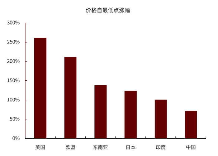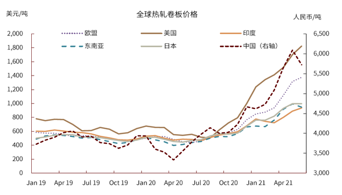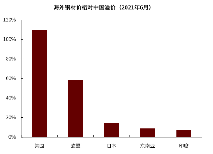 自去年下半年全球经济重启以来,作为工业和建筑原材料的钢材在全球范围内都进入了上行通道。钢材价格虽然普涨,但上涨的先后与幅度却在国家之间有所差异。中国的经济恢复最早,钢材价格也最早开始上行,但上涨幅度在全球范围内比较却显得相对温和,美国的经济重启虽较晚,但钢材价格的涨幅却相对较大,至今涨幅高达260%。当前海外对中国钢材溢价为美国:110%、欧盟:58%、日本:15%、东南亚:9%、印度:7.7%。