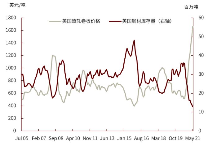 美国经济自经济重启后,终端消费率先复苏,带动建筑、机械、汽车等行业回暖,从今年3月份开始,钢材消费量同比转正,年化月度消费量也重新回到了一亿吨以上。但在供给侧,产量的恢复节奏却显著慢于下游,粗钢产能利用率在五月份才勉强达到疫情前的水平。今年以来,供给侧的扰动比较多,包括劳动力缺口与2月份的极端寒冷天气造成的缺电,都拖累了粗钢生产。受此影响,美国钢铁库存大幅去化,供需缺口持续扩大。