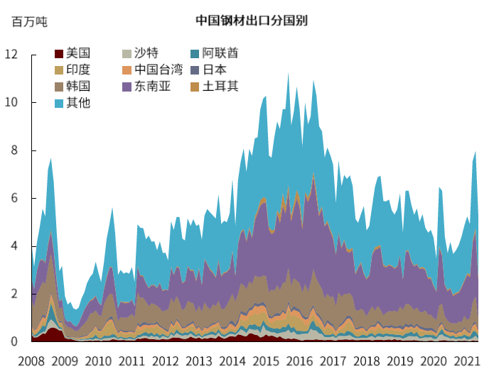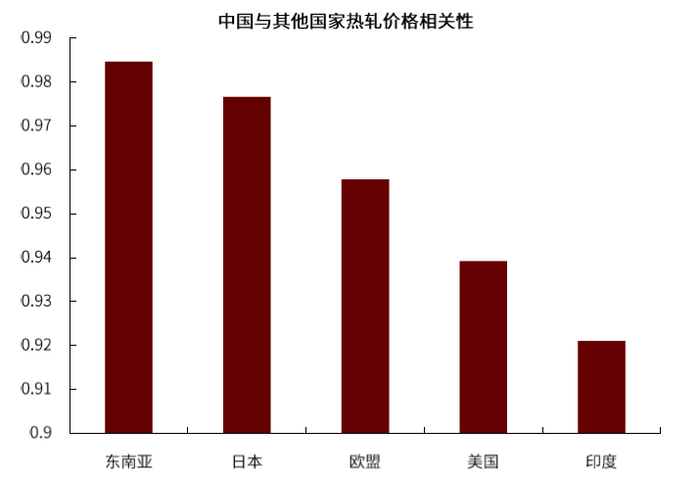 相比于铁矿石,钢材在全球范围内一直是一个区域定价的品种。从历史价格来看,中国钢材价格与美国的相关性低于东南亚、日本与欧盟,仅高于印度。价格传导机制的建立往往有赖于国与国之间的贸易关系。但在中美贸易摩擦开始前的2017年,中国直接出口到美国的钢材也仅约100万吨,占总出口约1.4%。因而我们认为中美之间直接的钢材价格传导效应可能比较弱。