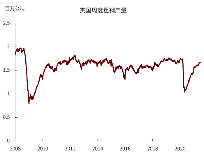 过去几年,美国的活跃粗钢产能一直比较稳定,维持在1.1亿吨钢每年的水平。特朗普政府执政以后实施的钢铁关税政策提振了美国的钢铁行业,产能利用率从2016年的71%稳步提升至2019年的81%。去年受新冠疫情影响,大约500万吨的产能被关停,产能利用率也一度跌至51%。今年以来,粗钢产出已逐渐逼近了疫情前的水平,且距离金融危机之前的高点还有一定上涨的空间。