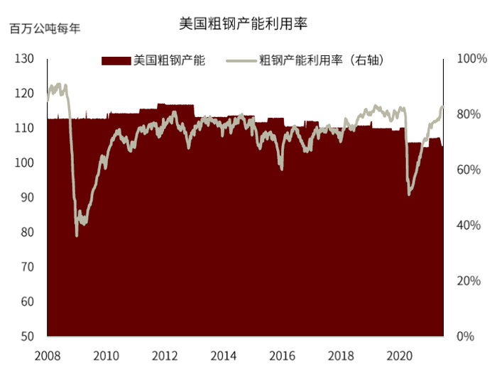 我们预计部分受新冠疫情而关停的闲置产能可能会逐渐回归,高钢价亦会刺激并加速新产能的建设。但从2008年金融危机以后的经验来看,供给端的弹性可能仍比较小。在2008年到2014年的黑色金属牛市期间,美国粗钢产能的年化复合增长率仅约0.9%。参照这个速度,美国未来几年粗钢产能扩张可能将慢于消费增长,意味着短期内仍将依靠挖掘现有产能的潜力与进口来满足需求。但在产能利用率已逐渐见顶的情况下叠加贸易政策短期内出现转向的可能性不大,我们认为供需的缺口可能将持续存在。