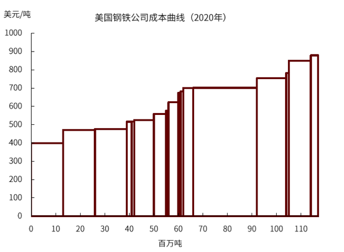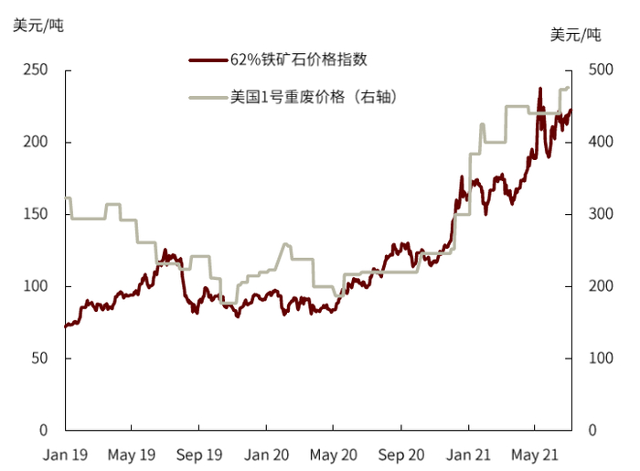 成本端对钢材价格的推动作用也不容忽视。从生产流程来看,美国的废钢资源禀赋较好,因此粗钢中约70%的来源是依靠以废钢为主要原料的电弧炉,剩余的30%的转炉钢,主要用来生产工艺要求较高的汽车用钢。去年四季度以来,铁矿石和废钢价格均翻了一倍有余,意味着钢材生产成本也显著上升,带动成本曲线大幅左移。