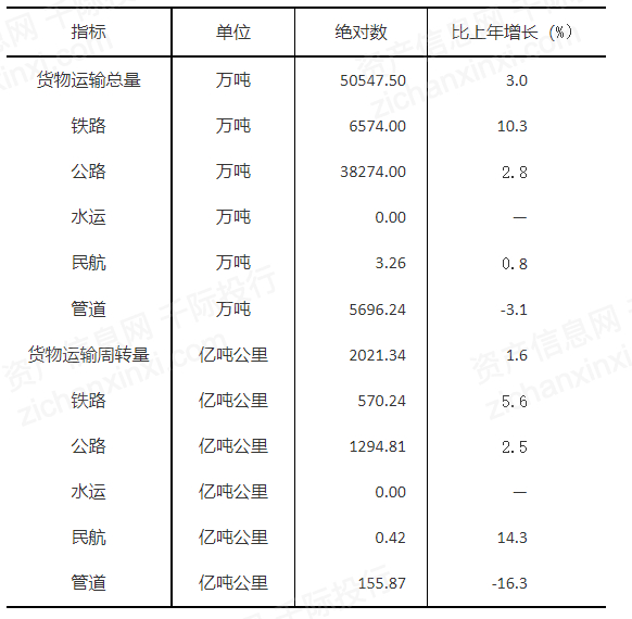 全年全省货物运输总量5.05亿吨,比上年增长3.0%;货物运输周转量2021.34亿吨公里,增长1.6%。全年共保障运输起降航班8.66万架次,完成旅客吞吐量1042.39万人次。