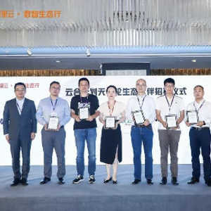 鹏博士智慧云事业部华东区直销业务总经理高杨(右3),领取了由阿里云智能销售管理与生态发展部总经理郭继军(左1)颁发的“共建应用新生态,天使轮合作伙伴证书”