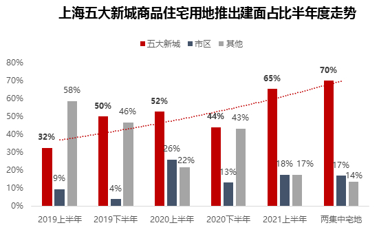 2021年上半年,上海已推出的商品住宅用地中五大新城建面占比达65%,其中首批两集中宅地里五大新城占比达70%,较往年大幅提升,占比创下新高。上海供地结构进一步向五大新城倾斜已是大势所趋,结合上海城市中心区域存量土地资源极度稀缺,而新城地处郊区,闲置土地相对较多,叠加各项利好政策以及发展需要的现状,可以预见五大新城将成为上海未来土地市场的主力军。