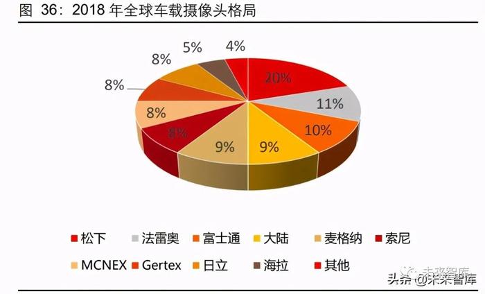 模组封装环节是车载摄像头能否满足车规级要求的核心环节,其对可靠性、抗干扰性的 要求苛刻,相较于手机摄像头模组车载产品的封装难度较大,因此成本占比更高。较高 的技术以及认证壁垒意味着海外松下、法雷奥、富士通、索尼等厂商存在一定先发优势, 占据较高份额,国内舜宇光学等厂商仍处于加速追赶期。