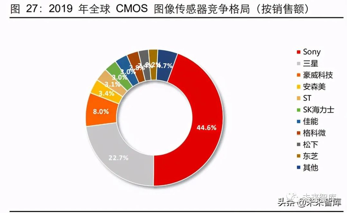 CMOS行业集中度高,马太效应明显。按照销售额口径,2019 年 CMOS 行业前 5 家 厂商的市占率超过 81%,Sony、三星、豪威位居前三甲。在汽车 CMOS 细分领域,按 照销售额口径,2018 年前五家厂商市占率超过 75%。不难看出,未来进入壁垒将随着 技术研发能力、资金投入而水涨船高,龙头公司有望享受行业高度集中带来的红利。
