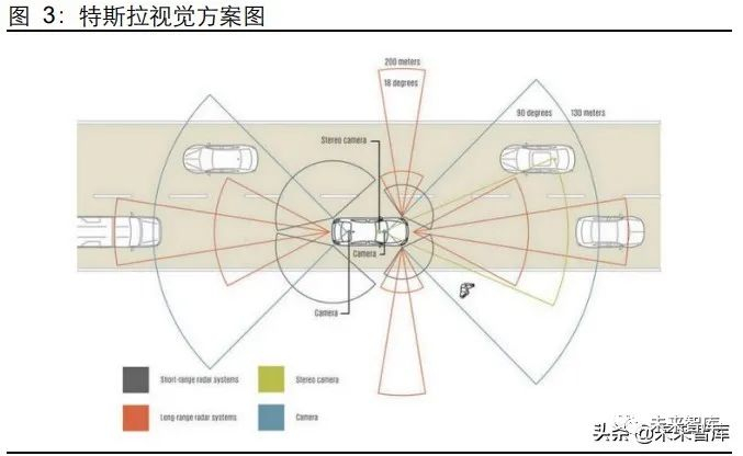 特斯拉持续推动纯视觉方案在自动驾驶的上限,视觉系智能驾驶已经成为当下最为主流 的方案之一。特斯拉相对于激光雷达方案,更青睐于以纯视觉来实现高阶的自动驾驶。特斯拉研发的 Tesla Vision 基于深度神经网络,能够对行车环境进行专业的解构分析, 相比传统视觉处理技术可靠性更高,能够充分利用搭载的高性能摄像头。特斯拉 Autopilot 自动辅助驾驶环绕车身共配有 8 个摄像头,视野范围达 360 度,对周围环境 的监测距离最远可达 250 米。前视主视野摄像头、宽视野摄像头、窄视野摄像头最大监 测距离分别为 150 米、60 米、250 米,用来识别物体并为导航提供支持,探测可能影响到车辆的物体,并根据情况采取制动措施;侧方后视摄像头(2 颗)、侧方前视摄像头 (2 颗)最大监测距离分别为 100 米、80 米,可以监测周围环境,防止视野盲区;后视 摄像头最大监测距离 50 米,为停车和障碍物探测提供支持。