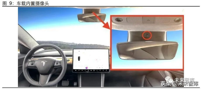 内置摄像头的数量 1-2 颗,主要作用是检测驾驶员的状态。内置摄像头主要是帮助实现 驾驶员监测系统,可以随时检测驾驶员的疲劳特征,在驾驶员疲劳时做出警示,确保驾 驶者在合适驾驶车辆的状态。自动驾驶在技术层面和法规层面均尚未完善,内置摄像 头可以保证驾驶员注意力依然保持在汽车驾驶的状态,让自动驾驶和人工驾驶切换更为 有效。