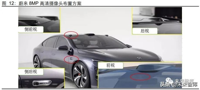 最新上市的智能汽车均开始搭载 8MP 高清摄像头。吉利的极氪001 就搭载了 8颗ADS 高清摄像头(8MP):前视*3(前挡风玻璃:1 个双目 + 1 个长焦单目)+ 侧后视*2(翼 子板) + 侧前视*2(外后视镜底座) + 后视*2(车顶后部)。上汽智己L7 搭载 7颗ADS 摄像头(5MP)。蔚来 2022 年 Q1 季度即将交付的 ET7 也搭载了 8MP 高清摄像 头。以蔚来为例,蔚来 ET7 采用“摄像头+毫米波雷达+激光雷达多种异构传感器的融 合感知”的感知系统解决方案,传感器配置“激光雷达*1 + ADS 摄像头*7 + 环视摄像 头*4 + 毫米波雷达*5 +超声波雷达*12”,其中 7 颗 ADS 摄像头为 8MP 高清摄像头, 能实现超远距离视觉感知,可检测到 680m 外车辆 + 260m 外的锥桶 + 220m外的行 人。