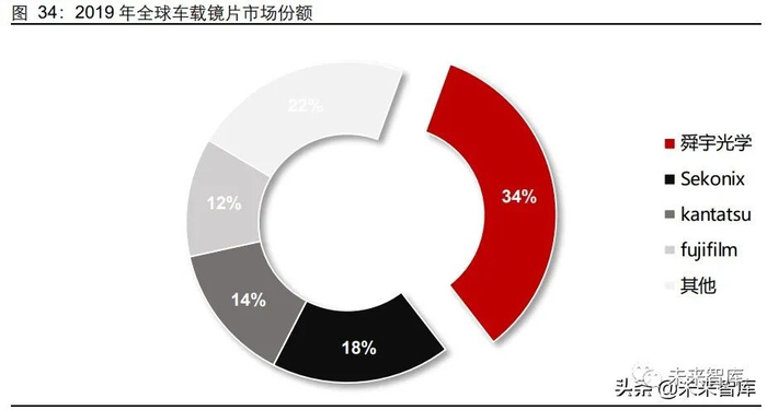 车载镜头产品门槛高、认证周期长,行业格局较为集中。安全性、可靠性、一致性是汽车零部件供应商认证的重要考量,因此 Tier 1 厂商倾向于选择已有认证的具备技术实力 的镜头厂商,未来行业进入壁垒或将提高。由此带来镜片行业格局集中,行业份额靠前 厂商包括舜宇光学、Sekonix 等,2019 年 CR4 份额高达 78%。
