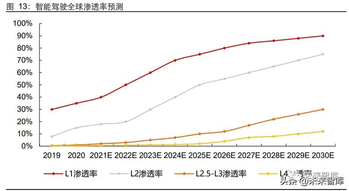 汽车智能化是驱动摄像头放量的核心因素,具备智能驾驶功能的车型渗透率到 2025 年 预计将达到 75%左右。一方面是 L1&L2 低等级智能驾驶中如 AEB、环视等配置渗透率 提升带来摄像头需求提升,另一方面随着 L3 以上自动驾驶对视觉系统的依赖需要至少 7-9 颗摄像头。随着智能变革带来汽车竞争力转变,智能驾驶渗透率将进入加速渗透期。2018 年,海外咨询机构 Yole 等均对未来智能驾驶渗透给予了比较乐观的预计,预计 2025 年和 2030 年具备智能驾驶的车型达到 69%和 87%。目前随着科技企业加速进入 汽车行业,智能驾驶渗透率有望进一步提速,尤其接近 L3 功能的 L2.5 智能驾驶(如特 斯拉 NOA、小鹏 NGP 等)实际量产时间持续提前。我们预计到 2025 年辅助驾驶(L1 为代表)和自动驾驶(L2.5-L3 为代表)渗透率分别达到 75%和 10%,而到 2030 年将 分别达到 90%和 30%。