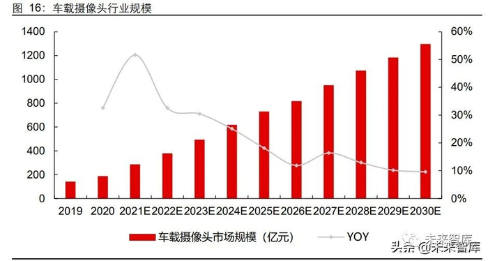 目前 120 万像素的摄像头平均在 150 元人民币,500 万像素摄像头平均价格有望超过 300 元,而 800 万像素价格或超过 500 元。我们认为随着摄像头像素的持续提升,行业 单车价值将稳中有升。我们假设 L1 级使用的摄像头像素相对较低,平均价格维持在单 个 150 元,L2.5 级以上智能驾驶需要更高清的摄像头,平均价格单个摄像头为 300 元。根据上述摄像头出货需求的测算,我们预计摄像头行业规模 2025 年和 2030 年将分别 达到 730 亿和 1297 亿人民币。