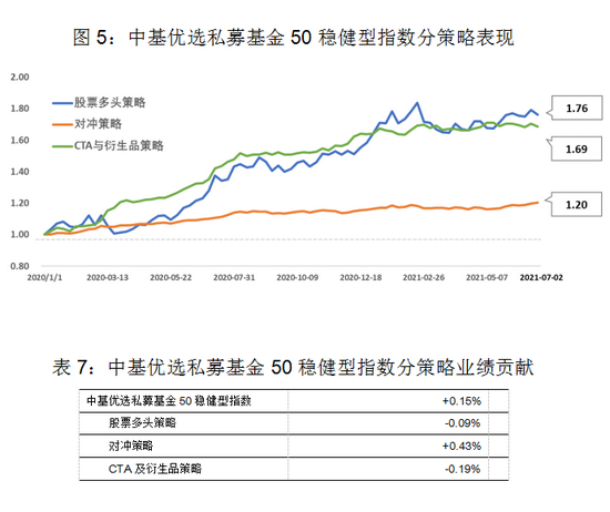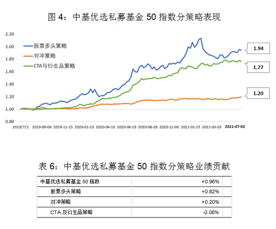 2021年6月,A股以震荡为主,重心缓慢上行、衍生品市场波动趋于降低,50指数上涨0.96%,三类策略中股票多头策略、对冲策略对指数有正贡献,股票多头策略为指数贡献约0.82%的收益,对冲策略贡献0.2%、CTA及衍生品策略亏损0.06%。