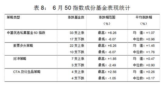6月,50支成份基金中有33支基金净值上涨,三类策略中股票多头策略和对冲策略下的大多数成份基金盈利。