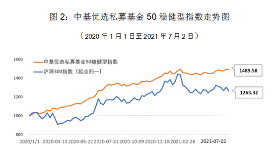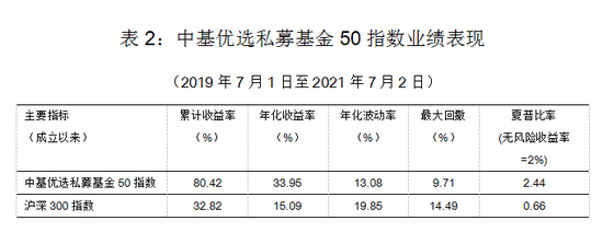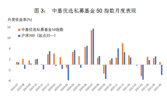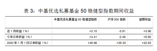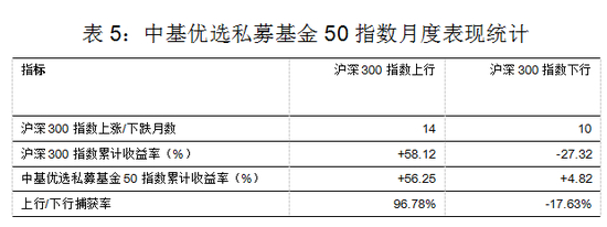 在自2019年7月起至今的24个月中,中基优选私募基金50指数有15个月跑赢指数,尤其是在沪深300指数出现下跌的10个月中,50指数均跑赢沪深300指数。