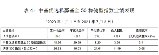 50指数的首个二级指数——中基优选私募基金50稳健型指数(以下简称“50稳健型指数”)的基准日为2020年1月1日,指数在6月期间表现良好,涨幅为0.15%。