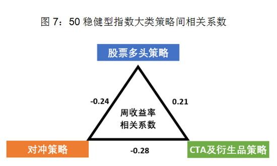50稳健型指数策略间的相关性更低,且存在“此消彼长”式的负相关关系。三类策略的相关性绝对值最高不过0.3,其中对冲策略与股票多头策略、CTA及衍生品策略均为负相关,股票多头策略与CTA及衍生品策略虽为正相关,但从绝对值上看是三者间最低的。