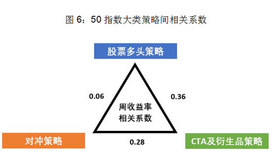 各类策略内基金的相关性也较低,股票策略的表现由于受系统性风险这个共同因素的影响,组内成份基金相关系数的平均值为0.63,处于相对较低水平;对冲策略、CTA与衍生品策略的组内成份基金相关系数的平均值分别为0.27、0.26,均处于低度正相关水平,这样的低组内相关性是二级策略差异化配置的成果,使风险在很大程度上得到了分散,是50指数获得相对较高夏普比率的主要原因。