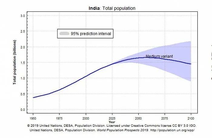 联合国2019年报告预测称,目前人口接近14亿的印度将在2027年超过中国,成为世界第一人口大国。印度总和生育率是2.2,略高于2.1的替代水平——即生育两个孩子,正好与父辈完成交替更迭的水平。