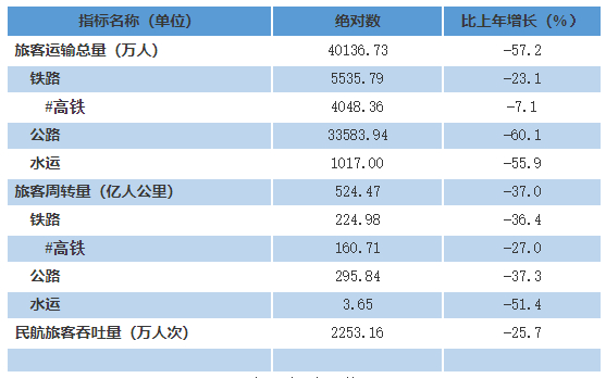 全年全省铁路、公路、水运旅客运输总量40136.73万人,比上年下降57.2%;旅客周转量524.47亿人公里,下降37.0%。民航旅客吞吐量2253.16万人次,比上年下降25.7%。