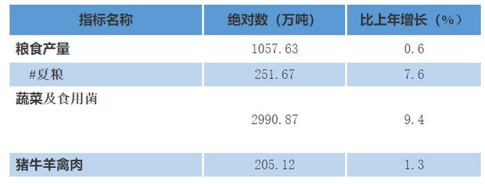 全年全省粮食种植面积4131.20万亩,比上年增长1.7%;粮食总产量1057.63万吨,比上年增长0.6%。全年蔬菜及食用菌种植面积2266.99万亩,比上年增长5.3%;蔬菜及食用菌产量2990.87万吨,比上年增长9.4%。年末果园面积1169.20万亩,比上年末增长13.9%;全年园林水果产量478.58万吨,比上年增长30.4%。