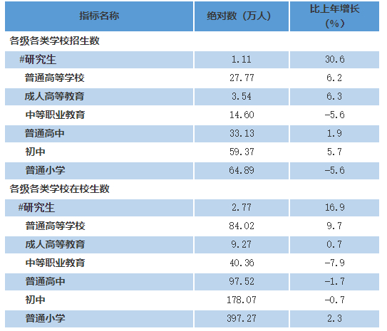 年末全省拥有普通小学6855所,在校生397.27万人;初中学校2020所,在校生178.07万人;普通高中471所,在校生97.52万人;中等职业教育(学校)184所,在校生40.36万人;普通高等学校75所,在校生84.02万人;研究生培养单位10个,在学研究生2.77万人。九年义务教育巩固率95.0%,高中阶段毛入学率90.7%,高等教育毛入学率41.6%。