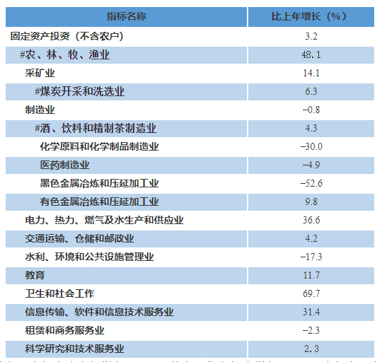 全年全省固定资产投资(不含农户)比上年增长3.2%。其中,第一产业投资增长45.5%,第二产业投资增长11.4%,第三产业投资下降0.4%。工业投资增长11.8%。