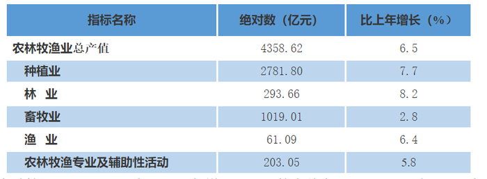 全年全省农林牧渔业总产值4358.62亿元,比上年增长6.5%。其中,种植业总产值2781.80亿元,增长7.7%;林业总产值293.66亿元,增长8.2%;畜牧业总产值1019.01亿元,增长2.8%;渔业总产值61.09亿元,增长6.4%。