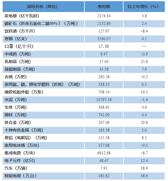 全年全省生产智能电视机183.62万台,比上年增长48.6%;汽车7.91万辆,增长38.9%;铁合金207.09万吨,增长20.8%;电子元件48.47亿只,增长12.4%;辣椒制品45.58万吨,增长7.9%;原铝(电解铝)135.58万吨,增长6.1%。