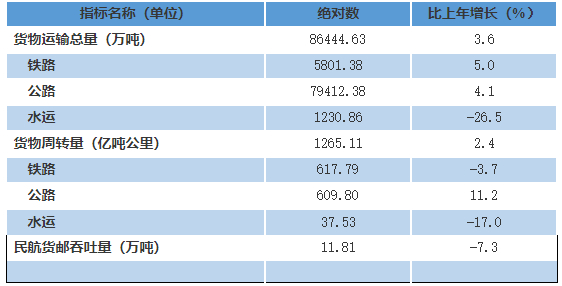 全年全省铁路、公路、水运货物运输总量86444.63万吨,比上年增长3.6%;货物周转量1265.11亿吨公里,增长2.4%。民航货邮吞吐量11.81万吨,比上年下降7.3%。