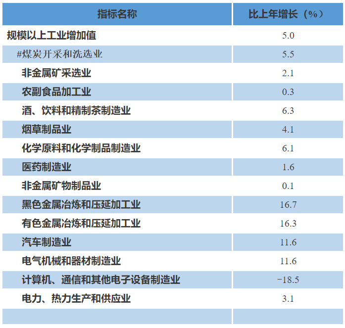全省19个重点监测的行业中,18个行业增加值保持增长。其中,黑色金属冶炼和压延加工业增加值比上年增长16.7%,有色金属冶炼和压延加工业增长16.3%,汽车制造业增长11.6%,电气机械和器材制造业增长11.6%,酒、饮料和精制茶制造业增长6.3%,煤炭开采和洗选业增长5.5%,电力、热力生产和供应业增长3.1%。