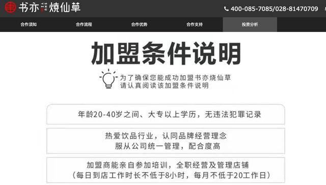 记者注意到,一些加盟品牌还对加盟商的学历和年龄提出要求。其中,西南领域发展较大的品牌“书亦烧仙草”官网显示,要求年龄20-40岁之间、大专以上学历。此外,大多数品牌都会要求加盟者全职经营店铺。