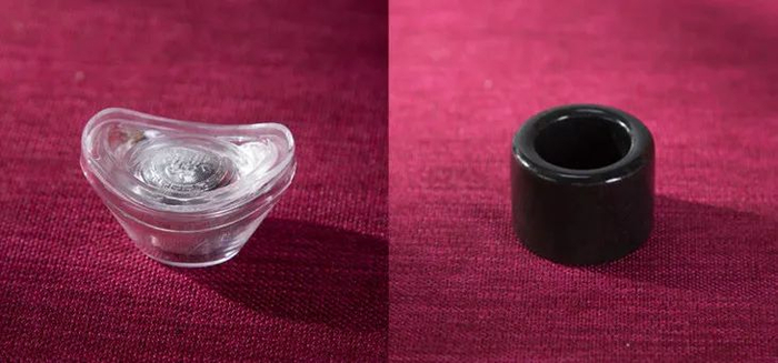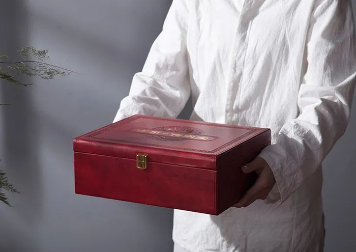 还附赠一枚10g银元宝和31g和田玉青玉扳指,皆被精心规整在中国红皮箱内,很有仪式感。