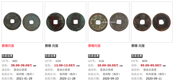 这套里的「景德元宝」,就因年号时间短、流通区域受限,现存量很少,能找到一枚着实不易。也难怪,它能一直在拍卖会上屡创佳绩。