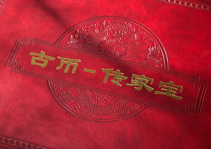 那皮箱盒盖,烫金“古币·传家宝”印在龙纹上,高雅大气。