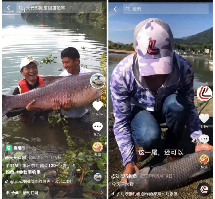 在抖音、快手平台上搜索“钓鱼”,有上百个相关账号。抖音发布的《2020抖音数据报告》显示,钓鱼是抖音用户最喜欢的休闲运动,相关视频点赞超过8亿次。