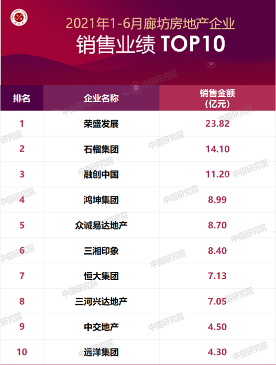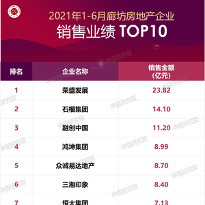 2021年1-6月廊坊房地产企业销售业绩排行榜