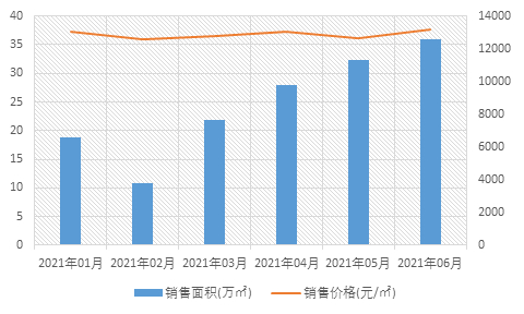 2021年1-6月,廊坊商品住宅共成交14980套/147.95万平米,总金额191.21亿元。2-6月,廊坊商品住宅成交面积呈稳步上升趋势,6月成交面积为36.03万平米,为上半年最高值;成交均价保持平稳态势,6月成交均价13211元/平米。