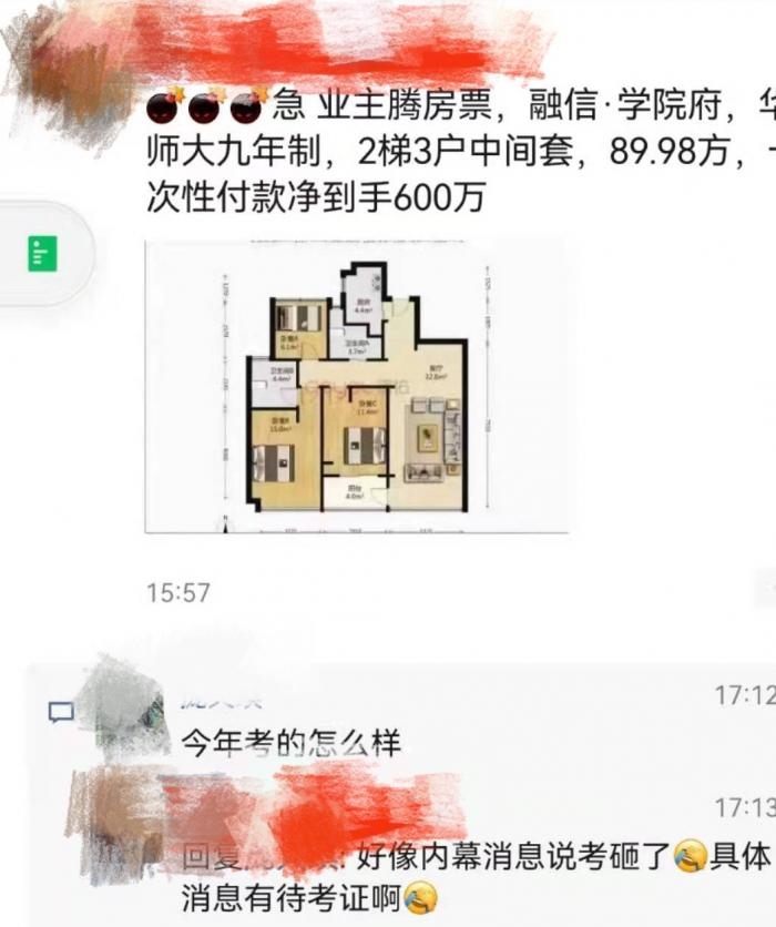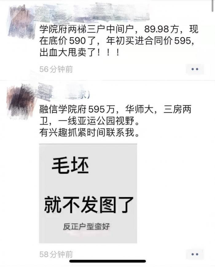 最近,在应先明(化名)朋友圈里的中介发布了多条融信学院府(融信蓝孔雀二期)二手房挂牌信息:融信学院府一套89平方米的房源,由于业主腾房票急售,到手价600万。很显然,这套房源的均价已经在6.7万元/平方米左右了。过了几天后,该名中介又发布了这套房源的信息:业主要求到手价590万。此外,学院府还有好几套号称年初买入现在亏本出售的房源。