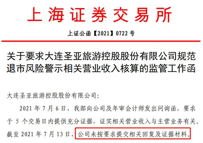 此前,在7月6日,上交所发出问询函,要求大连圣亚就相关问题于5个交易日内提供书面回复。如果未能在限期内回复,或未能提供充分证据证实相关收入的真实性、会计核算的合规性、收入与主营业务有关或具备商业实质,上交所将根据相关规定,要求公司进行扣除,并按照扣除后营收额决定是否对公司实施退市风险警示。