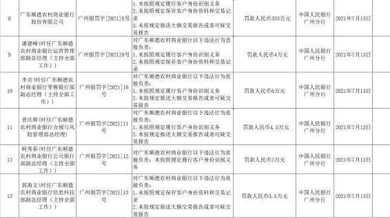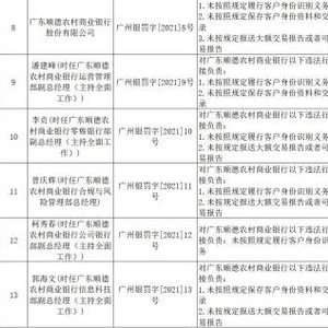 此外,对时任顺德农商行运营管理部副总经理潘建峰、零售银行部副总经理李贞、合规与风险管理部总经理曾庆辉、公司银行部副总经理柯秀春、信息科技部副总经理郭海文分别处于4万元、6万元、4.5万元、2万元、3.5万元罚款。