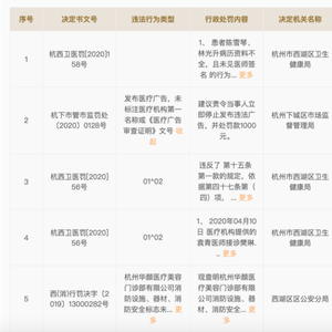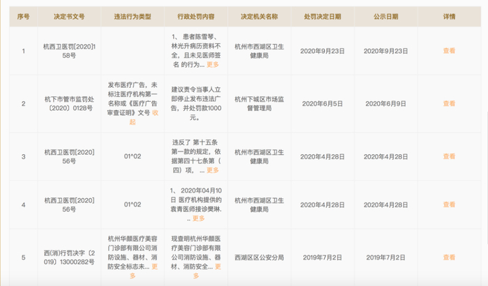 国家企业信用信息公示系统显示,2019年至2020年,杭州华颜医疗美容医院有限公司曾受到企业所在地卫健局、市场监管局和公安局5次行政处罚,其中4次集中于2020年。最近的一次处罚为去年9月23日,处罚信息显示,患者病历资料不全,且未见医师签名的行为被警告之余,罚款20000元。此外,违规开展口腔种植技术的行为,罚款30000元。