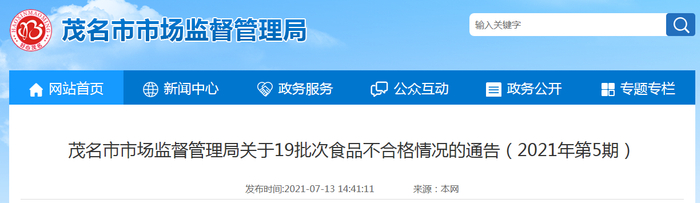 | 16 | 茂名市电白区和美饼家 | 茂名市电白区水东镇镇西东村 | 茂名市电白区和美饼家 | 茂名市电白区水东镇镇西东村 | 烘包 | 散装称重 | ———— | 2021-05-19 | 糕点 | 广东/市抽 | 茂名市食品药品检验所 | |||