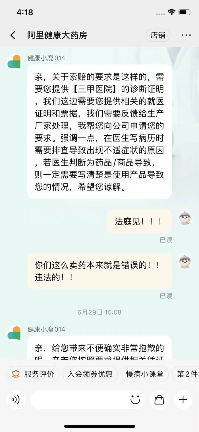 阳先生与阿里健康大药房客服的聊天记录显示,阳先生所购处方药无法退换,若要索赔,则需要阳先生提供“三甲医院的诊断证明,且医生在写病历时需要判断不适症状为药品/商品导致。”